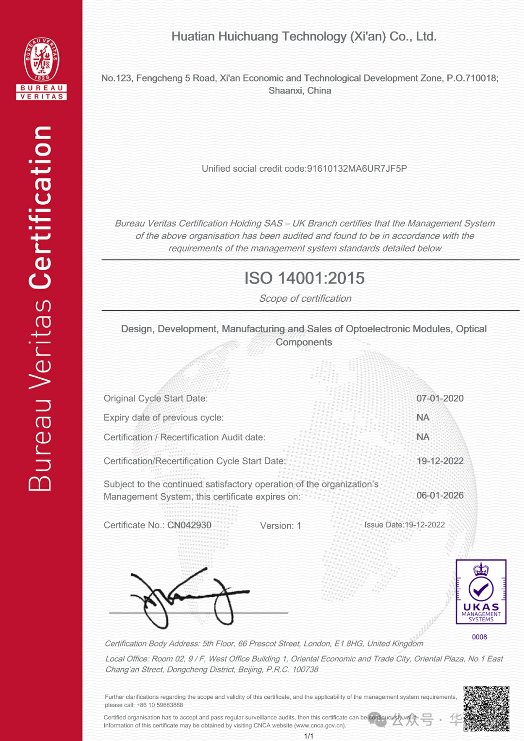 2020年1月7日,华天慧创首次通过了ISO14001:2015环境管理体系,认证范围包括光电模块、光学元器件的设计、研发、制造和销售。ISO14001环境管理体系的引入,体现了华天慧创对环境管理的重视。华天慧创的环境目标为:安全生产、节能降耗、保护环境、持续改善。