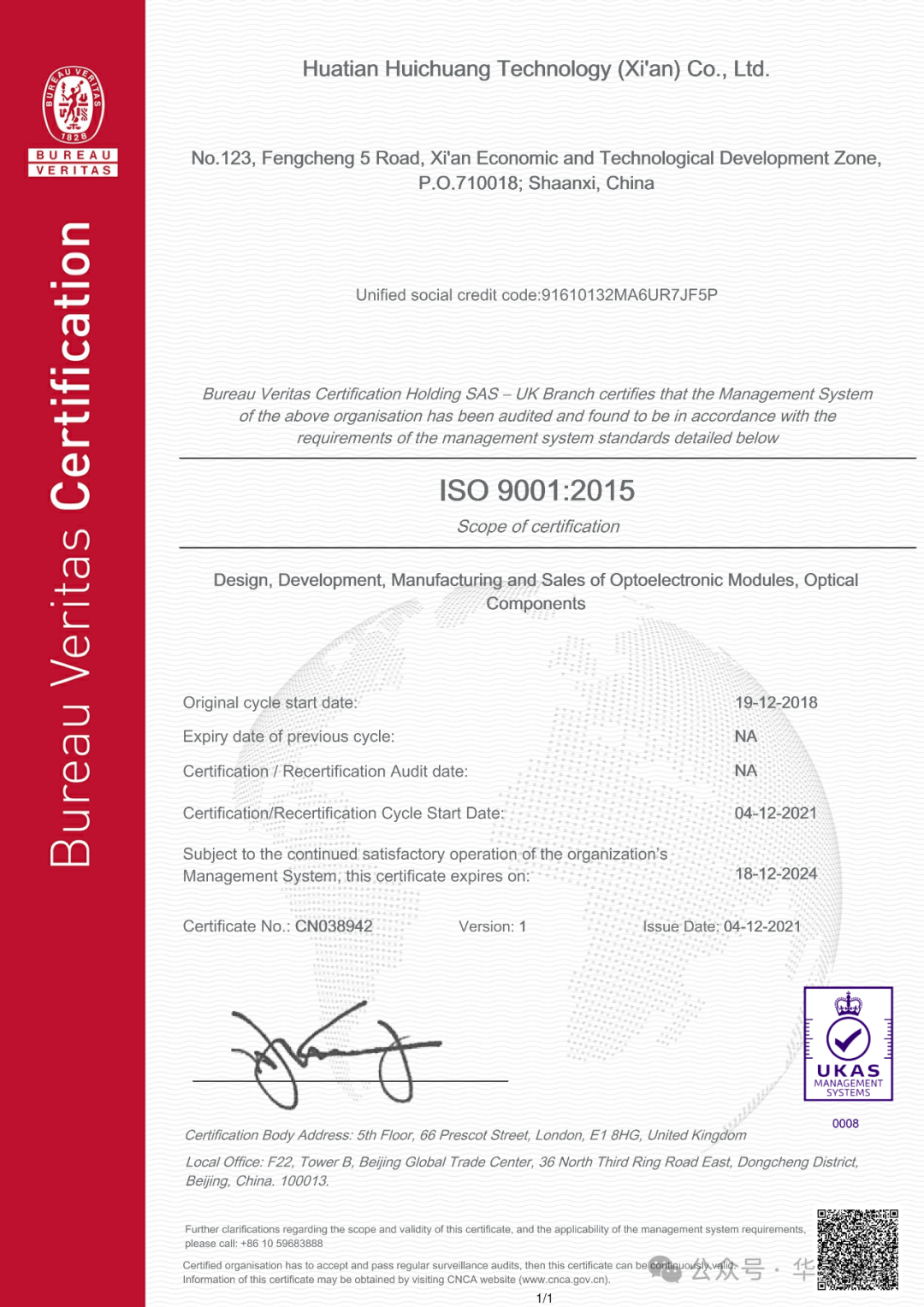 2018年12月19日,华天慧创首次通过了ISO9001:2015质量管理体系认证,其认证范围包括光电模块、光学元器件的设计、研发、制造和销售。ISO9001作为质量管理体系的国际标准,为华天慧创提供了一个框架,以确保其产品和服务满足客户和法规要求。
