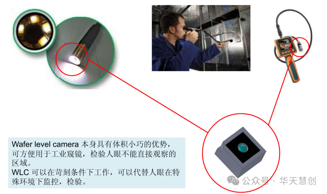 2016年,豪威科技(OmniVision Technologies)推出首款应用于医学领域的晶圆级摄像头模组:OVM6946。该镜头模组搭建在豪威科技的OmniBSI+像素结构之上,是业界中一次性内窥镜里最具性价比的单芯片成像解决方案。外形尺寸为1.05 mm x 1.05 mm x 2.27mm(长宽高),视场角达到120度,聚焦范围可从3mm增加到无穷远。此模组引脚减少,长距离传输后模拟信号的信噪比不会有较大的降低,可无缝集成到一次性内窥镜中。